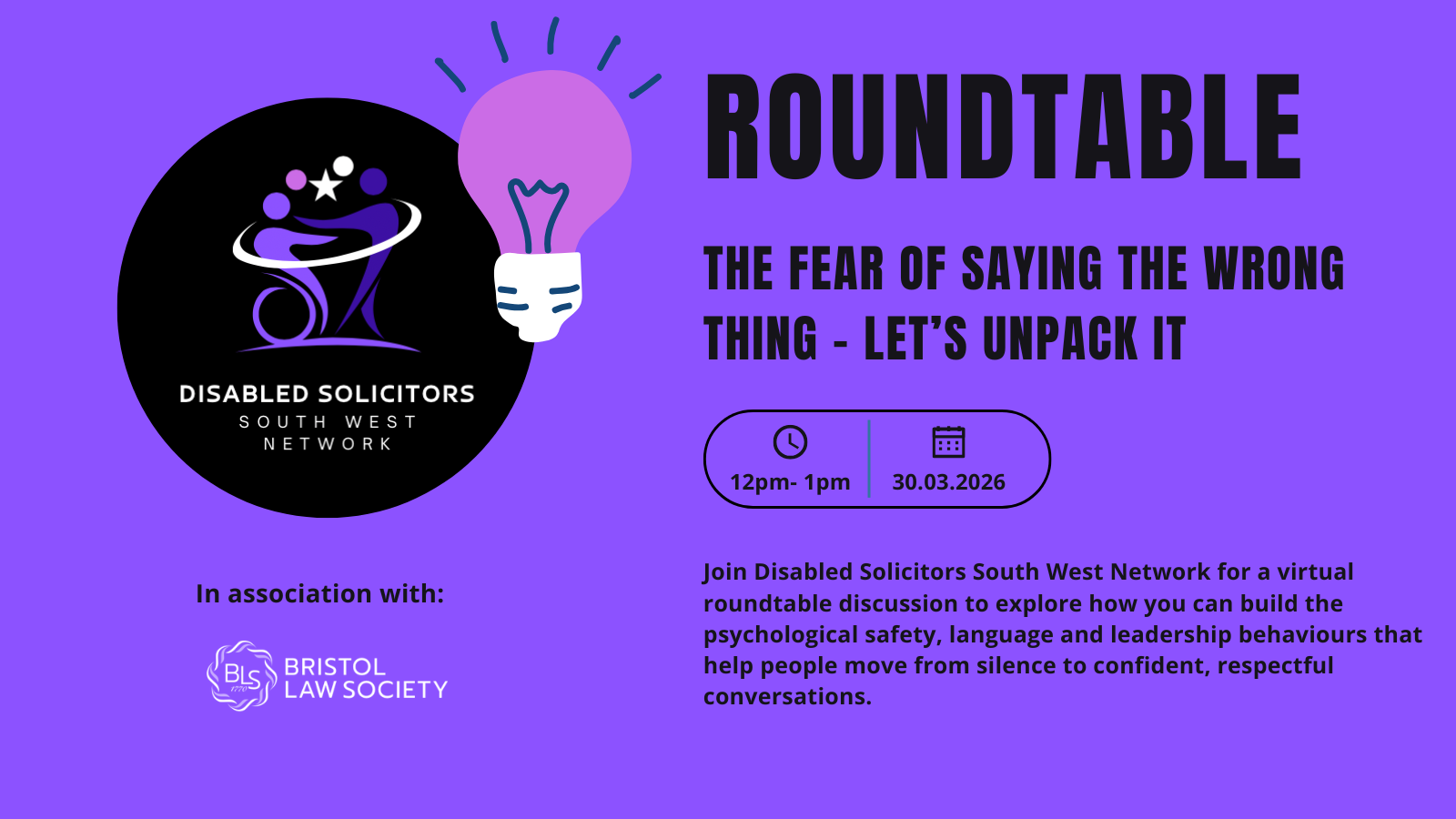 Join Disabled Solicitors South West Network for a virtual roundtable discussion to explore how you can build the psychological safety, language and leadership behaviours that help people move from silence to confident, respectful conversations