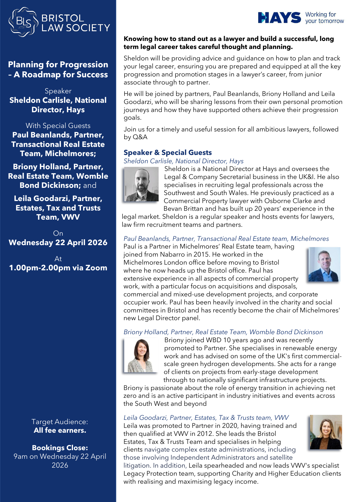 He will be joined by recently promoted senior lawyers, Paul Beanlands, Briony Holland and Leila Goodarzi, who will be sharing their personal promotion journeys and lessons learnt.
