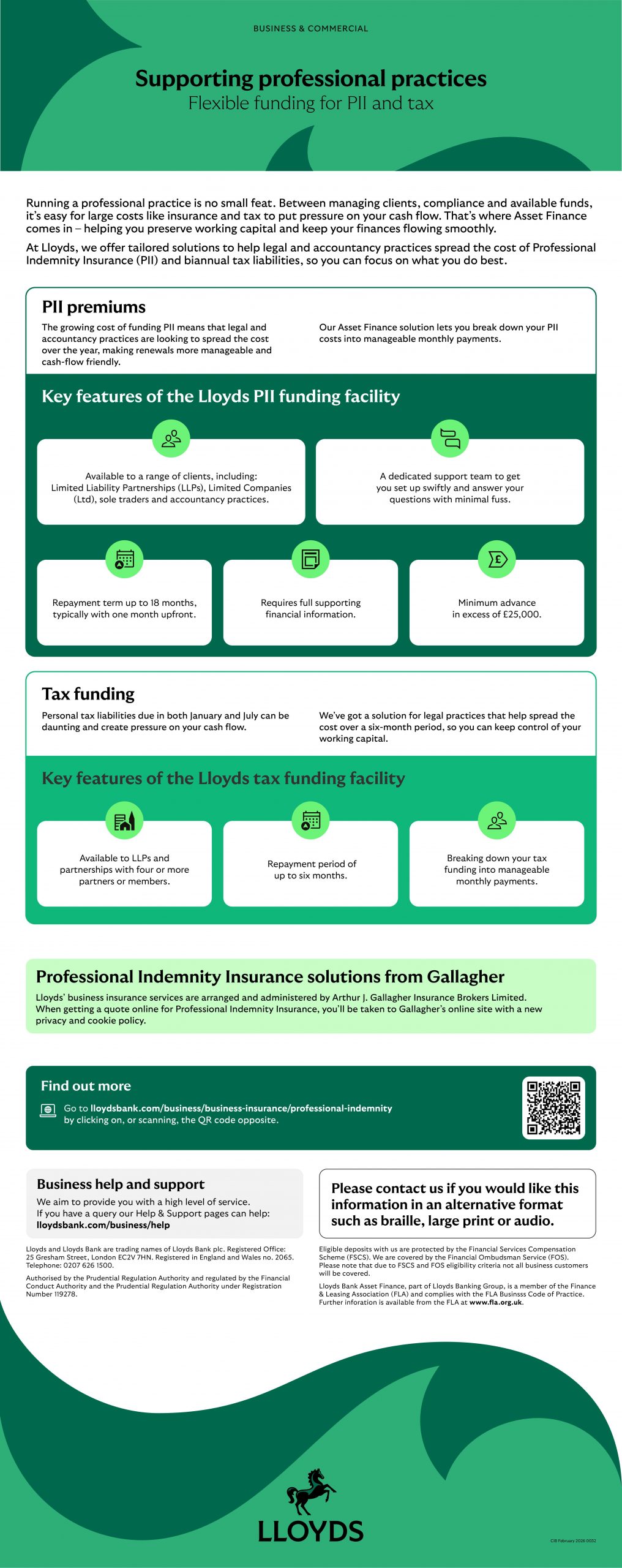 At Lloyds Bank, we have a range of Asset Finance based solutions that are designed to support our clients’ needs and address the challenges of funding both Professional Indemnity Insurance (PII) costs and annual tax liabilities.